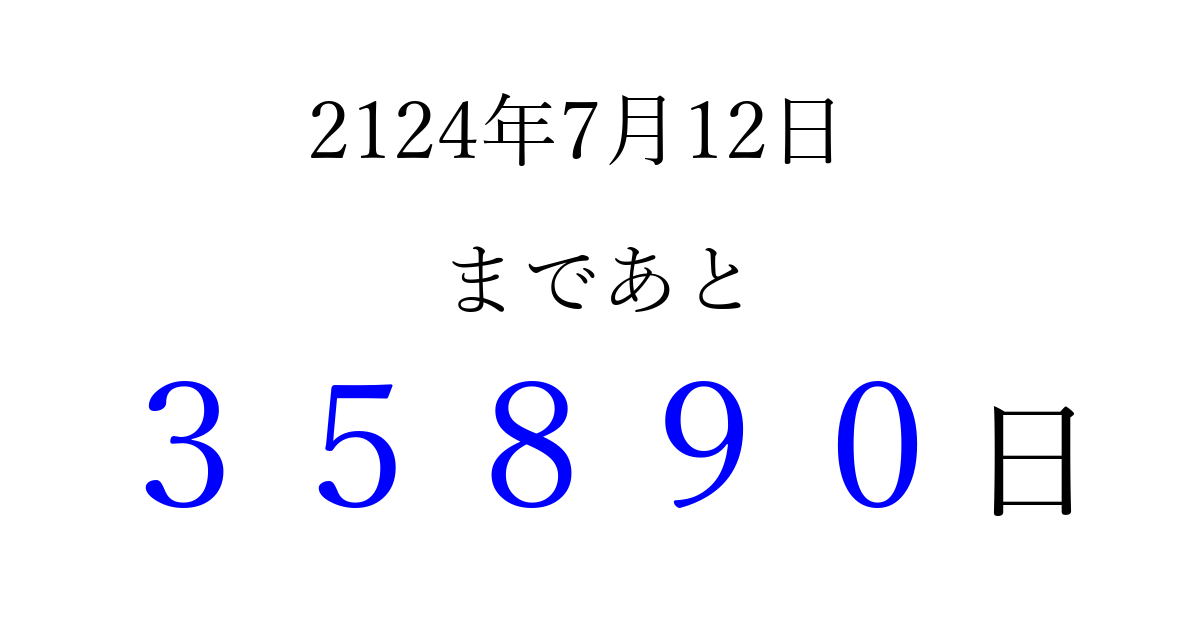 2124年7月12日(水)まで あと 99999 日です 追加すると、トップページからすぐ選べるようになります ※2026/04/07現在の結果です。 最新の状態に更新する ↓シェアして、タイムライン上にカウントダウンを表示しよう!↓ 📤 この結果を共有する Tweet シェア Threads Bluesky 別の日付でカウントダウン 2124年7月のカレンダー このページをブックマークに追加すると、いつでもカウントダウンを確認できます。 (PC: Ctrl+D / Mac: ⌘+D) hitome-notes.comでは以下のページも運営しています。 指定日と期間から日付を計算 | ガチャ確率計算・シミュレーション | プライバシー・ポリシー 運営者:Avocado
