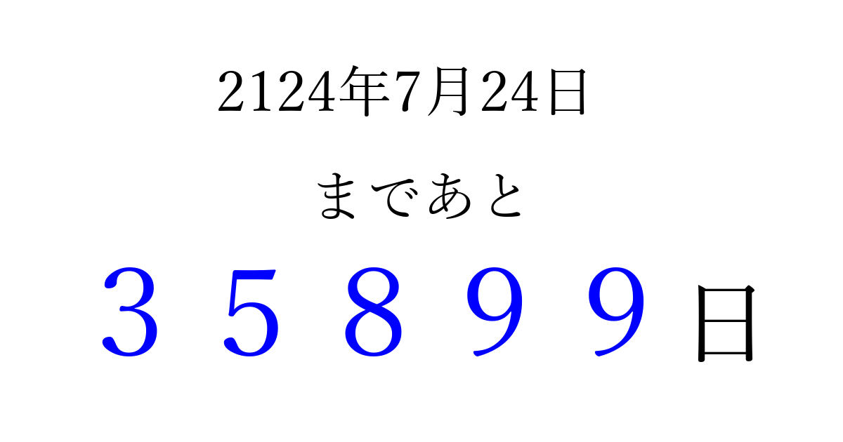 2124年7月24日(月)まで あと 99999 日です 追加すると、トップページからすぐ選べるようになります ※2026/04/10現在の結果です。 最新の状態に更新する ↓シェアして、タイムライン上にカウントダウンを表示しよう!↓ 📤 この結果を共有する Tweet シェア Threads Bluesky 別の日付でカウントダウン 2124年7月のカレンダー このページをブックマークに追加すると、いつでもカウントダウンを確認できます。 (PC: Ctrl+D / Mac: ⌘+D) hitome-notes.comでは以下のページも運営しています。 指定日と期間から日付を計算 | ガチャ確率計算・シミュレーション | プライバシー・ポリシー 運営者:Avocado