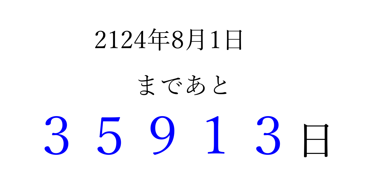 2124年8月1日(火)まで あと 99999 日です 追加すると、トップページからすぐ選べるようになります ※2026/04/04現在の結果です。 最新の状態に更新する ↓シェアして、タイムライン上にカウントダウンを表示しよう!↓ 📤 この結果を共有する Tweet シェア Threads Bluesky 別の日付でカウントダウン 2124年8月のカレンダー このページをブックマークに追加すると、いつでもカウントダウンを確認できます。 (PC: Ctrl+D / Mac: ⌘+D) hitome-notes.comでは以下のページも運営しています。 指定日と期間から日付を計算 | ガチャ確率計算・シミュレーション | プライバシー・ポリシー 運営者:Avocado
