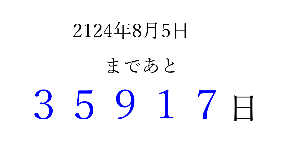 2124年8月5日(土)まで あと 99999 日です 追加すると、トップページからすぐ選べるようになります ※2026/04/04現在の結果です。 最新の状態に更新する ↓シェアして、タイムライン上にカウントダウンを表示しよう!↓ 📤 この結果を共有する Tweet シェア Threads Bluesky 別の日付でカウントダウン 2124年8月のカレンダー このページをブックマークに追加すると、いつでもカウントダウンを確認できます。 (PC: Ctrl+D / Mac: ⌘+D) hitome-notes.comでは以下のページも運営しています。 指定日と期間から日付を計算 | ガチャ確率計算・シミュレーション | プライバシー・ポリシー 運営者:Avocado