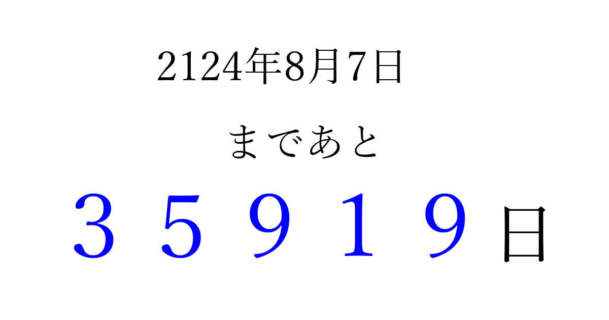 2124年8月7日(月)まで あと 99999 日です 追加すると、トップページからすぐ選べるようになります ※2026/04/04現在の結果です。 最新の状態に更新する ↓シェアして、タイムライン上にカウントダウンを表示しよう!↓ 📤 この結果を共有する Tweet シェア Threads Bluesky 別の日付でカウントダウン 2124年8月のカレンダー このページをブックマークに追加すると、いつでもカウントダウンを確認できます。 (PC: Ctrl+D / Mac: ⌘+D) hitome-notes.comでは以下のページも運営しています。 指定日と期間から日付を計算 | ガチャ確率計算・シミュレーション | プライバシー・ポリシー 運営者:Avocado