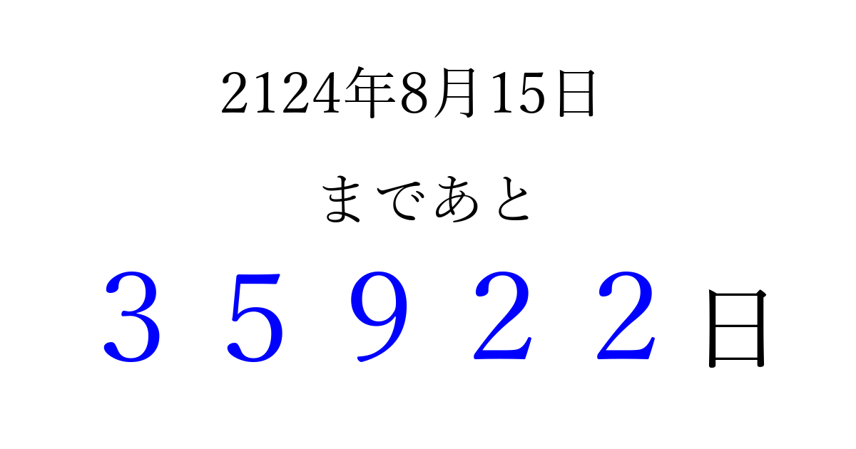 2124年8月15日(火)まで あと 99999 日です 追加すると、トップページからすぐ選べるようになります ※2026/04/09現在の結果です。 最新の状態に更新する ↓シェアして、タイムライン上にカウントダウンを表示しよう!↓ 📤 この結果を共有する Tweet シェア Threads Bluesky 別の日付でカウントダウン 2124年8月のカレンダー このページをブックマークに追加すると、いつでもカウントダウンを確認できます。 (PC: Ctrl+D / Mac: ⌘+D) hitome-notes.comでは以下のページも運営しています。 指定日と期間から日付を計算 | ガチャ確率計算・シミュレーション | プライバシー・ポリシー 運営者:Avocado
