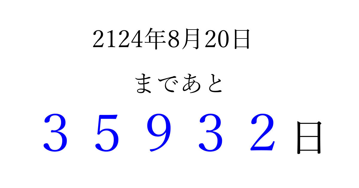 2124年8月20日(日)まで あと 99999 日です 追加すると、トップページからすぐ選べるようになります ※2026/04/04現在の結果です。 最新の状態に更新する ↓シェアして、タイムライン上にカウントダウンを表示しよう!↓ 📤 この結果を共有する Tweet シェア Threads Bluesky 別の日付でカウントダウン 2124年8月のカレンダー このページをブックマークに追加すると、いつでもカウントダウンを確認できます。 (PC: Ctrl+D / Mac: ⌘+D) hitome-notes.comでは以下のページも運営しています。 指定日と期間から日付を計算 | ガチャ確率計算・シミュレーション | プライバシー・ポリシー 運営者:Avocado