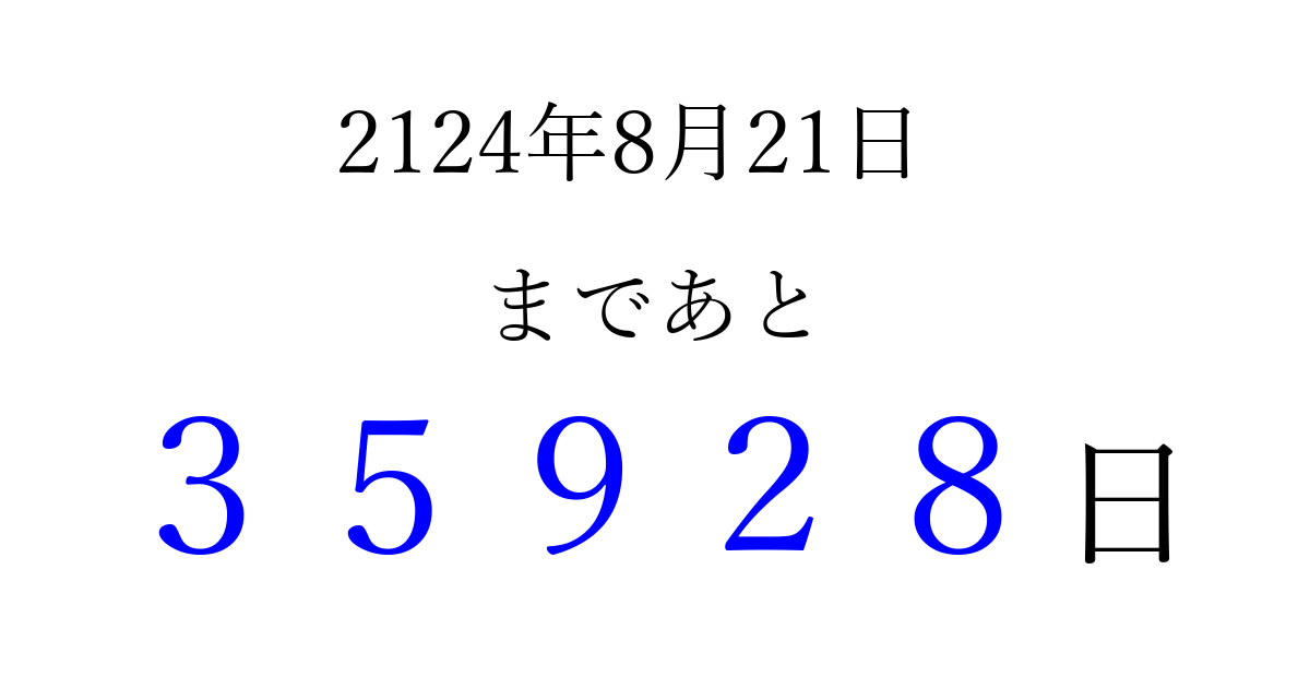 2124年8月21日(月)まで あと 99999 日です 追加すると、トップページからすぐ選べるようになります ※2026/04/09現在の結果です。 最新の状態に更新する ↓シェアして、タイムライン上にカウントダウンを表示しよう!↓ 📤 この結果を共有する Tweet シェア Threads Bluesky 別の日付でカウントダウン 2124年8月のカレンダー このページをブックマークに追加すると、いつでもカウントダウンを確認できます。 (PC: Ctrl+D / Mac: ⌘+D) hitome-notes.comでは以下のページも運営しています。 指定日と期間から日付を計算 | ガチャ確率計算・シミュレーション | プライバシー・ポリシー 運営者:Avocado
