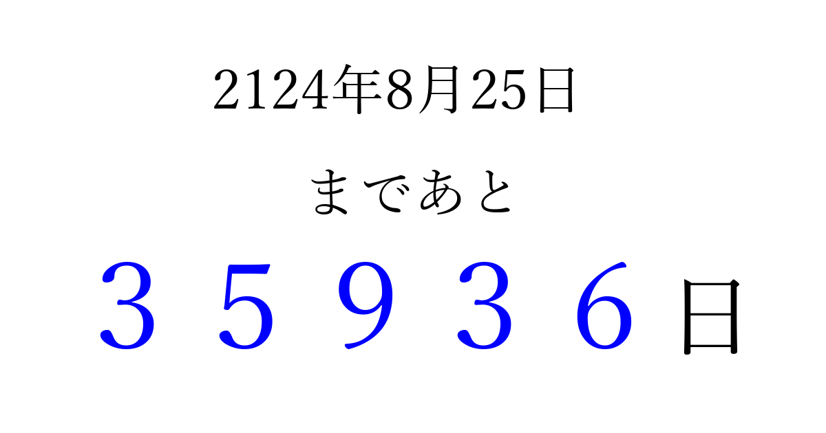 2124年8月25日(金)まで あと 99999 日です 追加すると、トップページからすぐ選べるようになります ※2026/04/05現在の結果です。 最新の状態に更新する ↓シェアして、タイムライン上にカウントダウンを表示しよう!↓ 📤 この結果を共有する Tweet シェア Threads Bluesky 別の日付でカウントダウン 2124年8月のカレンダー このページをブックマークに追加すると、いつでもカウントダウンを確認できます。 (PC: Ctrl+D / Mac: ⌘+D) hitome-notes.comでは以下のページも運営しています。 指定日と期間から日付を計算 | ガチャ確率計算・シミュレーション | プライバシー・ポリシー 運営者:Avocado