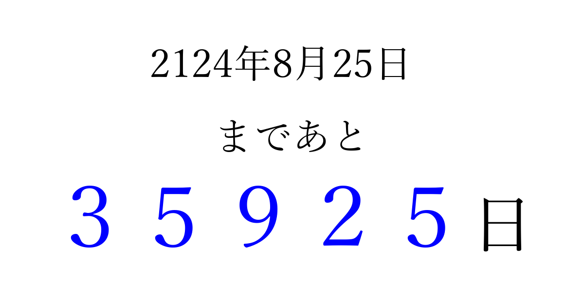 2124年8月25日(金)まで あと 99999 日です 追加すると、トップページからすぐ選べるようになります ※2026/04/16現在の結果です。 最新の状態に更新する ↓シェアして、タイムライン上にカウントダウンを表示しよう!↓ 📤 この結果を共有する Tweet シェア Threads Bluesky 別の日付でカウントダウン 2124年8月のカレンダー このページをブックマークに追加すると、いつでもカウントダウンを確認できます。 (PC: Ctrl+D / Mac: ⌘+D) hitome-notes.comでは以下のページも運営しています。 指定日と期間から日付を計算 | ガチャ確率計算・シミュレーション | プライバシー・ポリシー 運営者:Avocado