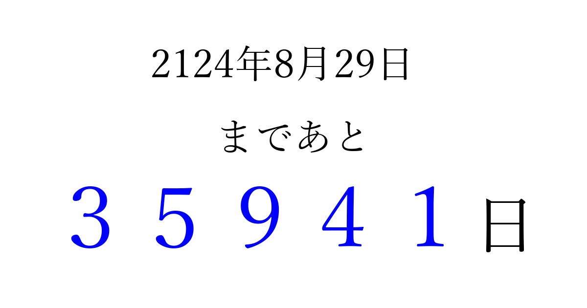 2124年8月29日(火)まで あと 99999 日です 追加すると、トップページからすぐ選べるようになります ※2026/04/04現在の結果です。 最新の状態に更新する ↓シェアして、タイムライン上にカウントダウンを表示しよう!↓ 📤 この結果を共有する Tweet シェア Threads Bluesky 別の日付でカウントダウン 2124年8月のカレンダー このページをブックマークに追加すると、いつでもカウントダウンを確認できます。 (PC: Ctrl+D / Mac: ⌘+D) hitome-notes.comでは以下のページも運営しています。 指定日と期間から日付を計算 | ガチャ確率計算・シミュレーション | プライバシー・ポリシー 運営者:Avocado