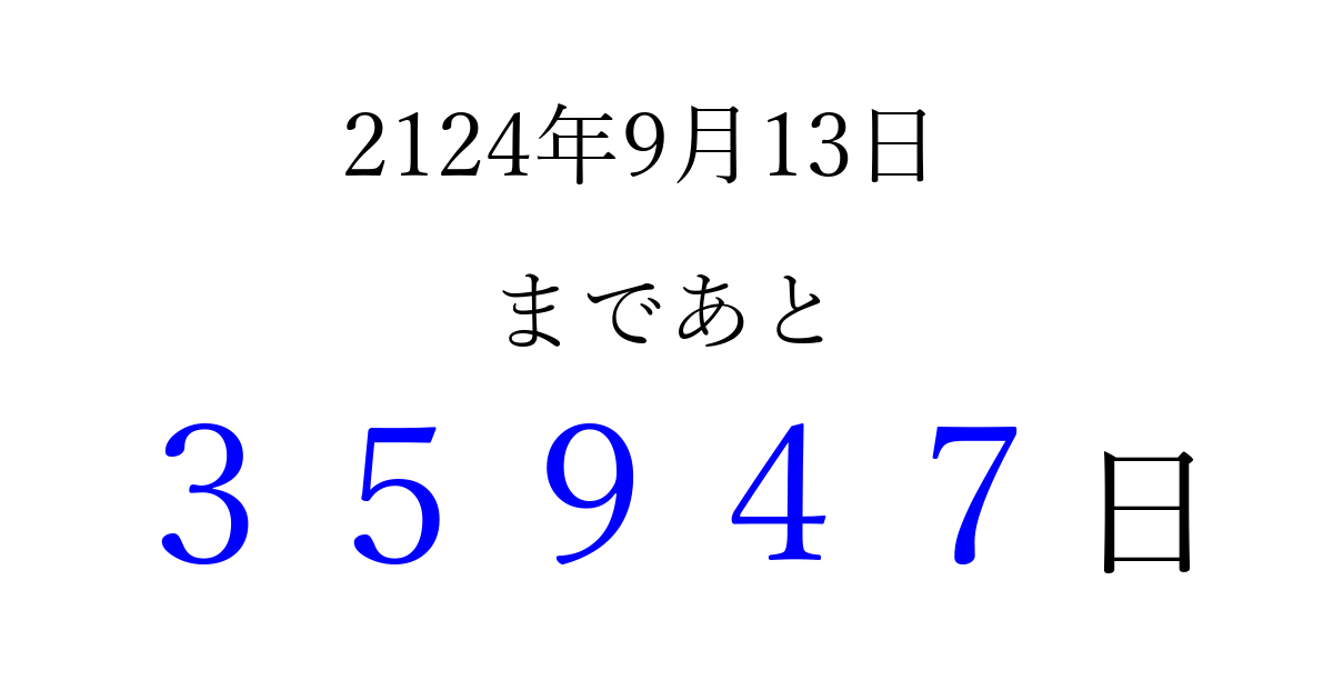 2124年9月13日(水)まで あと 99999 日です 追加すると、トップページからすぐ選べるようになります ※2026/04/13現在の結果です。 最新の状態に更新する ↓シェアして、タイムライン上にカウントダウンを表示しよう!↓ 📤 この結果を共有する Tweet シェア Threads Bluesky 別の日付でカウントダウン 2124年9月のカレンダー このページをブックマークに追加すると、いつでもカウントダウンを確認できます。 (PC: Ctrl+D / Mac: ⌘+D) hitome-notes.comでは以下のページも運営しています。 指定日と期間から日付を計算 | ガチャ確率計算・シミュレーション | プライバシー・ポリシー 運営者:Avocado