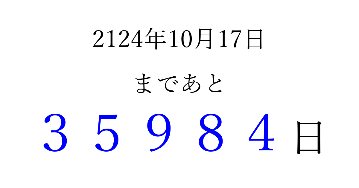 2124年10月17日(火)まで あと 99999 日です 追加すると、トップページからすぐ選べるようになります ※2026/04/10現在の結果です。 最新の状態に更新する ↓シェアして、タイムライン上にカウントダウンを表示しよう!↓ 📤 この結果を共有する Tweet シェア Threads Bluesky 別の日付でカウントダウン 2124年10月のカレンダー このページをブックマークに追加すると、いつでもカウントダウンを確認できます。 (PC: Ctrl+D / Mac: ⌘+D) hitome-notes.comでは以下のページも運営しています。 指定日と期間から日付を計算 | ガチャ確率計算・シミュレーション | プライバシー・ポリシー 運営者:Avocado