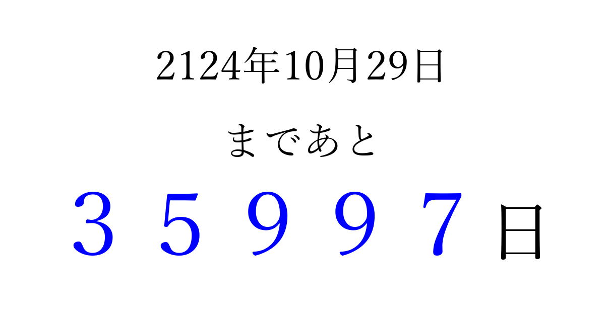 2124年10月29日(日)まで あと 99999 日です 追加すると、トップページからすぐ選べるようになります ※2026/04/09現在の結果です。 最新の状態に更新する ↓シェアして、タイムライン上にカウントダウンを表示しよう!↓ 📤 この結果を共有する Tweet シェア Threads Bluesky 別の日付でカウントダウン 2124年10月のカレンダー このページをブックマークに追加すると、いつでもカウントダウンを確認できます。 (PC: Ctrl+D / Mac: ⌘+D) hitome-notes.comでは以下のページも運営しています。 指定日と期間から日付を計算 | ガチャ確率計算・シミュレーション | プライバシー・ポリシー 運営者:Avocado
