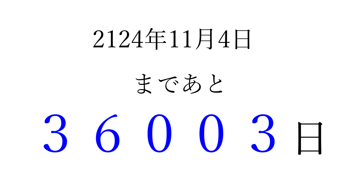 2124年11月4日(土)まで あと 99999 日です 追加すると、トップページからすぐ選べるようになります ※2026/04/09現在の結果です。 最新の状態に更新する ↓シェアして、タイムライン上にカウントダウンを表示しよう!↓ 📤 この結果を共有する Tweet シェア Threads Bluesky 別の日付でカウントダウン 2124年11月のカレンダー このページをブックマークに追加すると、いつでもカウントダウンを確認できます。 (PC: Ctrl+D / Mac: ⌘+D) hitome-notes.comでは以下のページも運営しています。 指定日と期間から日付を計算 | ガチャ確率計算・シミュレーション | プライバシー・ポリシー 運営者:Avocado