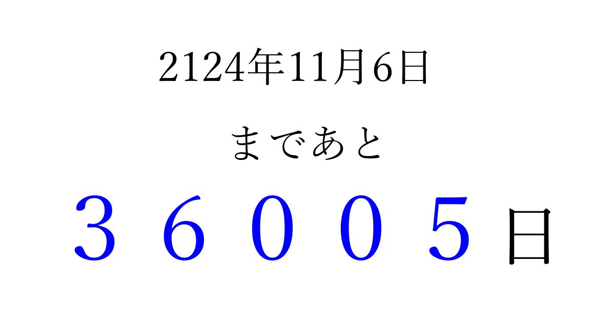 2124年11月6日(月)まで あと 99999 日です 追加すると、トップページからすぐ選べるようになります ※2026/04/09現在の結果です。 最新の状態に更新する ↓シェアして、タイムライン上にカウントダウンを表示しよう!↓ 📤 この結果を共有する Tweet シェア Threads Bluesky 別の日付でカウントダウン 2124年11月のカレンダー このページをブックマークに追加すると、いつでもカウントダウンを確認できます。 (PC: Ctrl+D / Mac: ⌘+D) hitome-notes.comでは以下のページも運営しています。 指定日と期間から日付を計算 | ガチャ確率計算・シミュレーション | プライバシー・ポリシー 運営者:Avocado