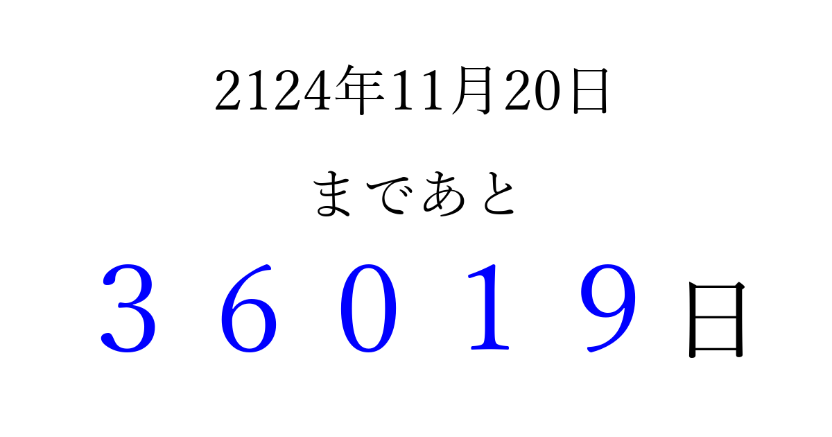 2124年11月20日(月)まで あと 99999 日です 追加すると、トップページからすぐ選べるようになります ※2026/04/09現在の結果です。 最新の状態に更新する ↓シェアして、タイムライン上にカウントダウンを表示しよう!↓ 📤 この結果を共有する Tweet シェア Threads Bluesky 別の日付でカウントダウン 2124年11月のカレンダー このページをブックマークに追加すると、いつでもカウントダウンを確認できます。 (PC: Ctrl+D / Mac: ⌘+D) hitome-notes.comでは以下のページも運営しています。 指定日と期間から日付を計算 | ガチャ確率計算・シミュレーション | プライバシー・ポリシー 運営者:Avocado