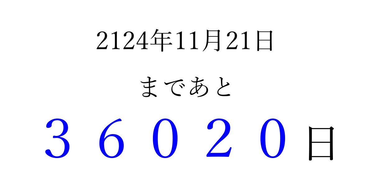 2124年11月21日(火)まで あと 99999 日です 追加すると、トップページからすぐ選べるようになります ※2026/04/09現在の結果です。 最新の状態に更新する ↓シェアして、タイムライン上にカウントダウンを表示しよう!↓ 📤 この結果を共有する Tweet シェア Threads Bluesky 別の日付でカウントダウン 2124年11月のカレンダー このページをブックマークに追加すると、いつでもカウントダウンを確認できます。 (PC: Ctrl+D / Mac: ⌘+D) hitome-notes.comでは以下のページも運営しています。 指定日と期間から日付を計算 | ガチャ確率計算・シミュレーション | プライバシー・ポリシー 運営者:Avocado