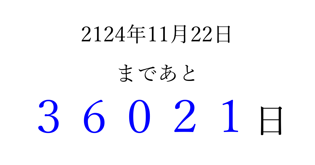 2124年11月22日(水)まで あと 99999 日です 追加すると、トップページからすぐ選べるようになります ※2026/04/09現在の結果です。 最新の状態に更新する ↓シェアして、タイムライン上にカウントダウンを表示しよう!↓ 📤 この結果を共有する Tweet シェア Threads Bluesky 別の日付でカウントダウン 2124年11月のカレンダー このページをブックマークに追加すると、いつでもカウントダウンを確認できます。 (PC: Ctrl+D / Mac: ⌘+D) hitome-notes.comでは以下のページも運営しています。 指定日と期間から日付を計算 | ガチャ確率計算・シミュレーション | プライバシー・ポリシー 運営者:Avocado