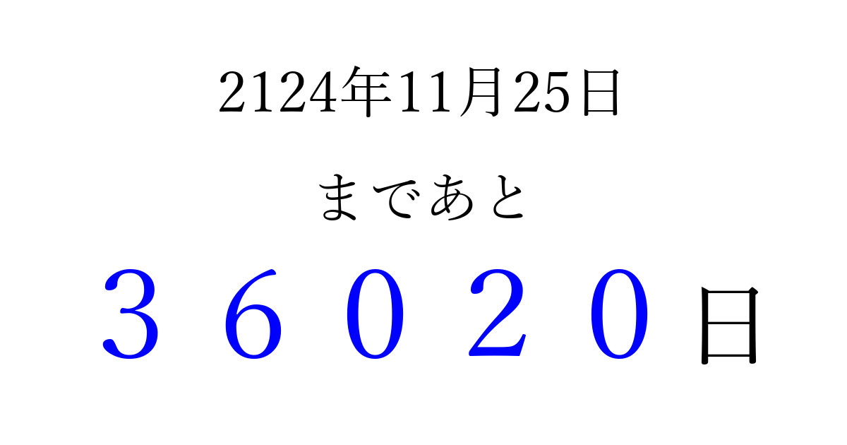 2124年11月25日(土)まで あと 99999 日です 追加すると、トップページからすぐ選べるようになります ※2026/04/13現在の結果です。 最新の状態に更新する ↓シェアして、タイムライン上にカウントダウンを表示しよう!↓ 📤 この結果を共有する Tweet シェア Threads Bluesky 別の日付でカウントダウン 2124年11月のカレンダー このページをブックマークに追加すると、いつでもカウントダウンを確認できます。 (PC: Ctrl+D / Mac: ⌘+D) hitome-notes.comでは以下のページも運営しています。 指定日と期間から日付を計算 | ガチャ確率計算・シミュレーション | プライバシー・ポリシー 運営者:Avocado