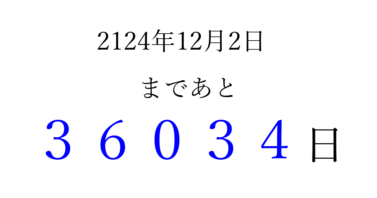 2124年12月2日(土)まで あと 99999 日です 追加すると、トップページからすぐ選べるようになります ※2026/04/06現在の結果です。 最新の状態に更新する ↓シェアして、タイムライン上にカウントダウンを表示しよう!↓ 📤 この結果を共有する Tweet シェア Threads Bluesky 別の日付でカウントダウン 2124年12月のカレンダー このページをブックマークに追加すると、いつでもカウントダウンを確認できます。 (PC: Ctrl+D / Mac: ⌘+D) hitome-notes.comでは以下のページも運営しています。 指定日と期間から日付を計算 | ガチャ確率計算・シミュレーション | プライバシー・ポリシー 運営者:Avocado