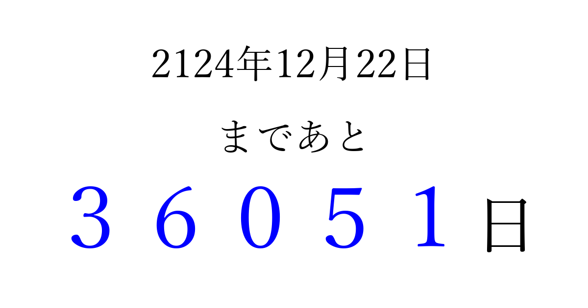 2124年12月22日(金)まで あと 99999 日です 追加すると、トップページからすぐ選べるようになります ※2026/04/09現在の結果です。 最新の状態に更新する ↓シェアして、タイムライン上にカウントダウンを表示しよう!↓ 📤 この結果を共有する Tweet シェア Threads Bluesky 別の日付でカウントダウン 2124年12月のカレンダー このページをブックマークに追加すると、いつでもカウントダウンを確認できます。 (PC: Ctrl+D / Mac: ⌘+D) hitome-notes.comでは以下のページも運営しています。 指定日と期間から日付を計算 | ガチャ確率計算・シミュレーション | プライバシー・ポリシー 運営者:Avocado