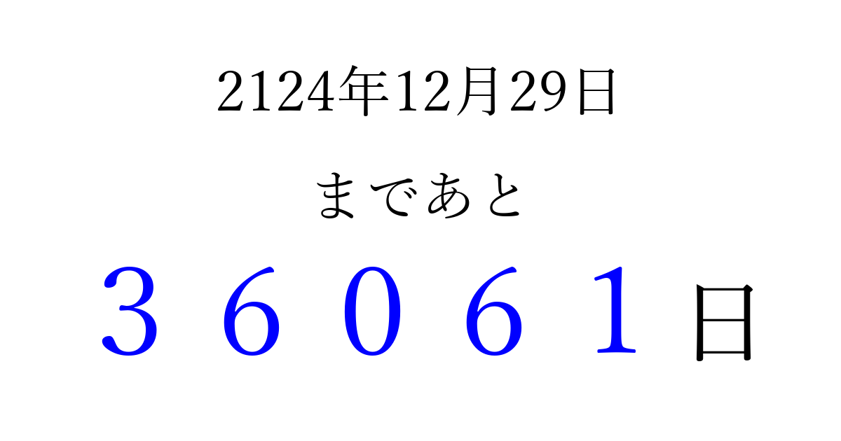 2124年12月29日(金)まで あと 99999 日です 追加すると、トップページからすぐ選べるようになります ※2026/04/06現在の結果です。 最新の状態に更新する ↓シェアして、タイムライン上にカウントダウンを表示しよう!↓ 📤 この結果を共有する Tweet シェア Threads Bluesky 別の日付でカウントダウン 2124年12月のカレンダー このページをブックマークに追加すると、いつでもカウントダウンを確認できます。 (PC: Ctrl+D / Mac: ⌘+D) hitome-notes.comでは以下のページも運営しています。 指定日と期間から日付を計算 | ガチャ確率計算・シミュレーション | プライバシー・ポリシー 運営者:Avocado