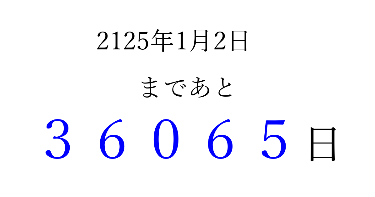 2125年1月2日(火)まで あと 99999 日です 追加すると、トップページからすぐ選べるようになります ※2026/04/06現在の結果です。 最新の状態に更新する ↓シェアして、タイムライン上にカウントダウンを表示しよう!↓ 📤 この結果を共有する Tweet シェア Threads Bluesky 別の日付でカウントダウン 2125年1月のカレンダー このページをブックマークに追加すると、いつでもカウントダウンを確認できます。 (PC: Ctrl+D / Mac: ⌘+D) hitome-notes.comでは以下のページも運営しています。 指定日と期間から日付を計算 | ガチャ確率計算・シミュレーション | プライバシー・ポリシー 運営者:Avocado