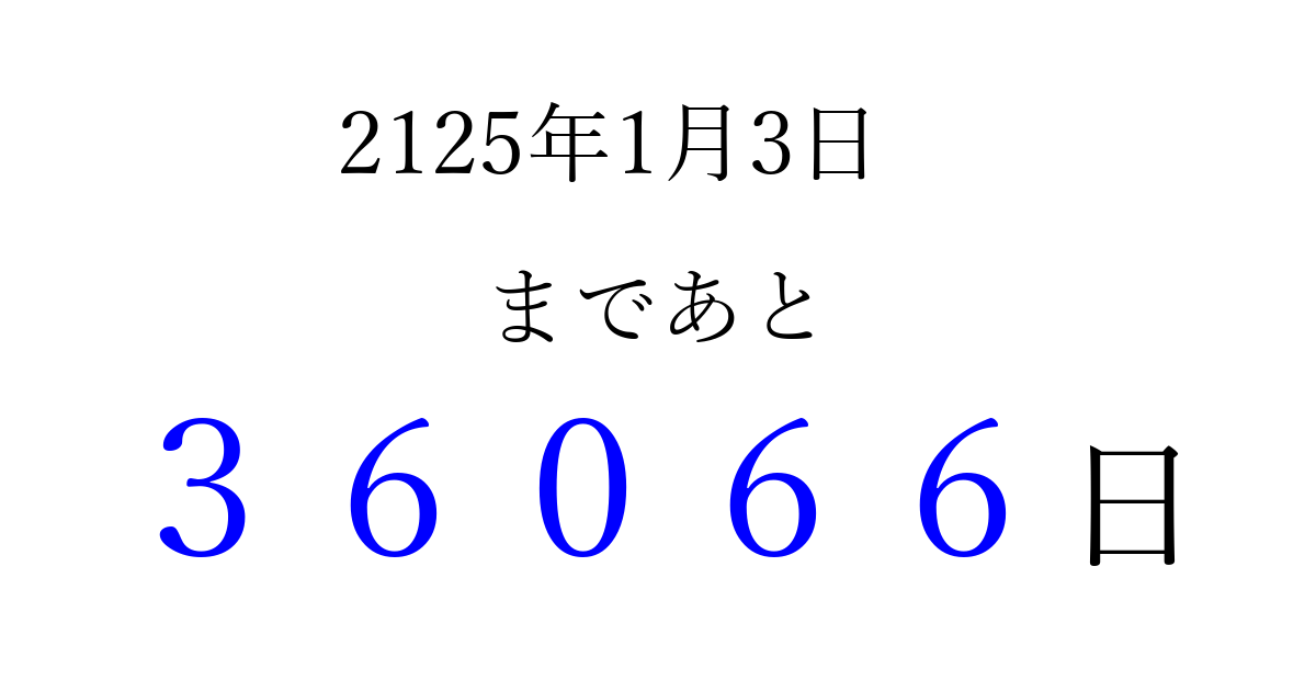 2125年1月3日(水)まで あと 99999 日です 追加すると、トップページからすぐ選べるようになります ※2026/04/06現在の結果です。 最新の状態に更新する ↓シェアして、タイムライン上にカウントダウンを表示しよう!↓ 📤 この結果を共有する Tweet シェア Threads Bluesky 別の日付でカウントダウン 2125年1月のカレンダー このページをブックマークに追加すると、いつでもカウントダウンを確認できます。 (PC: Ctrl+D / Mac: ⌘+D) hitome-notes.comでは以下のページも運営しています。 指定日と期間から日付を計算 | ガチャ確率計算・シミュレーション | プライバシー・ポリシー 運営者:Avocado
