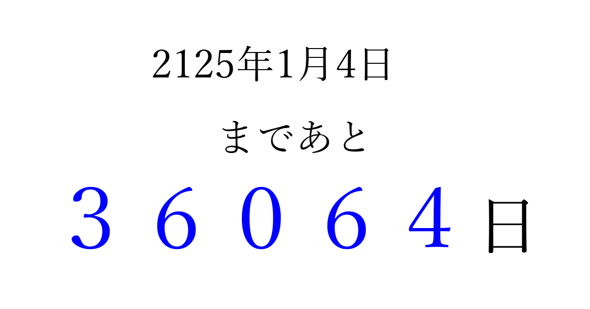 2125年1月4日(木)まで あと 99999 日です 追加すると、トップページからすぐ選べるようになります ※2026/04/09現在の結果です。 最新の状態に更新する ↓シェアして、タイムライン上にカウントダウンを表示しよう!↓ 📤 この結果を共有する Tweet シェア Threads Bluesky 別の日付でカウントダウン 2125年1月のカレンダー このページをブックマークに追加すると、いつでもカウントダウンを確認できます。 (PC: Ctrl+D / Mac: ⌘+D) hitome-notes.comでは以下のページも運営しています。 指定日と期間から日付を計算 | ガチャ確率計算・シミュレーション | プライバシー・ポリシー 運営者:Avocado