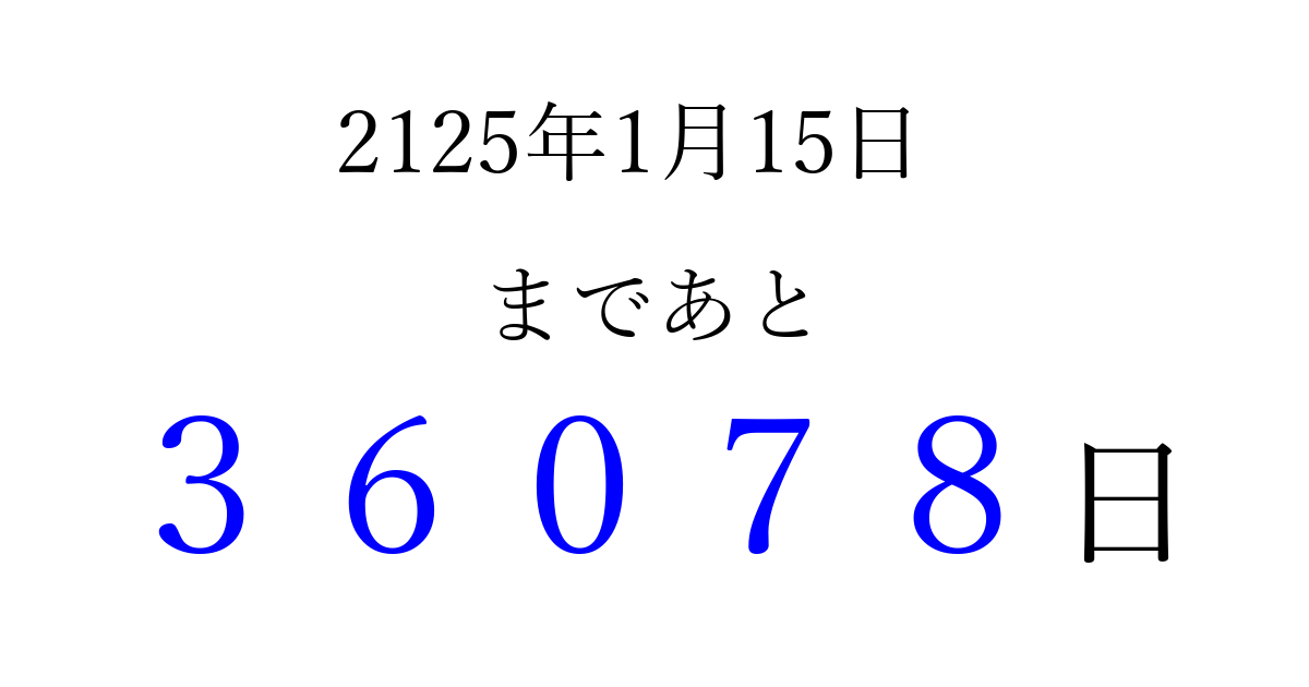 2125年1月15日(月)まで あと 99999 日です 追加すると、トップページからすぐ選べるようになります ※2026/04/06現在の結果です。 最新の状態に更新する ↓シェアして、タイムライン上にカウントダウンを表示しよう!↓ 📤 この結果を共有する Tweet シェア Threads Bluesky 別の日付でカウントダウン 2125年1月のカレンダー このページをブックマークに追加すると、いつでもカウントダウンを確認できます。 (PC: Ctrl+D / Mac: ⌘+D) hitome-notes.comでは以下のページも運営しています。 指定日と期間から日付を計算 | ガチャ確率計算・シミュレーション | プライバシー・ポリシー 運営者:Avocado