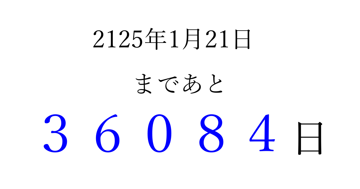 2125年1月21日(日)まで あと 99999 日です 追加すると、トップページからすぐ選べるようになります ※2026/04/06現在の結果です。 最新の状態に更新する ↓シェアして、タイムライン上にカウントダウンを表示しよう!↓ 📤 この結果を共有する Tweet シェア Threads Bluesky 別の日付でカウントダウン 2125年1月のカレンダー このページをブックマークに追加すると、いつでもカウントダウンを確認できます。 (PC: Ctrl+D / Mac: ⌘+D) hitome-notes.comでは以下のページも運営しています。 指定日と期間から日付を計算 | ガチャ確率計算・シミュレーション | プライバシー・ポリシー 運営者:Avocado