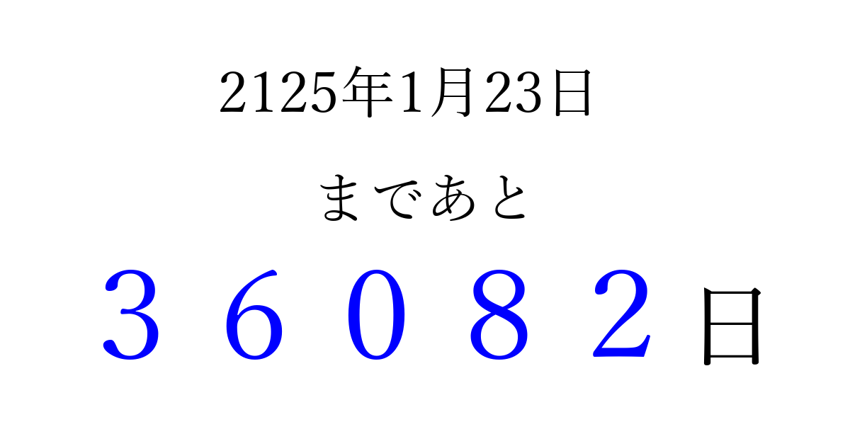 2125年1月23日(火)まで あと 99999 日です 追加すると、トップページからすぐ選べるようになります ※2026/04/10現在の結果です。 最新の状態に更新する ↓シェアして、タイムライン上にカウントダウンを表示しよう!↓ 📤 この結果を共有する Tweet シェア Threads Bluesky 別の日付でカウントダウン 2125年1月のカレンダー このページをブックマークに追加すると、いつでもカウントダウンを確認できます。 (PC: Ctrl+D / Mac: ⌘+D) hitome-notes.comでは以下のページも運営しています。 指定日と期間から日付を計算 | ガチャ確率計算・シミュレーション | プライバシー・ポリシー 運営者:Avocado