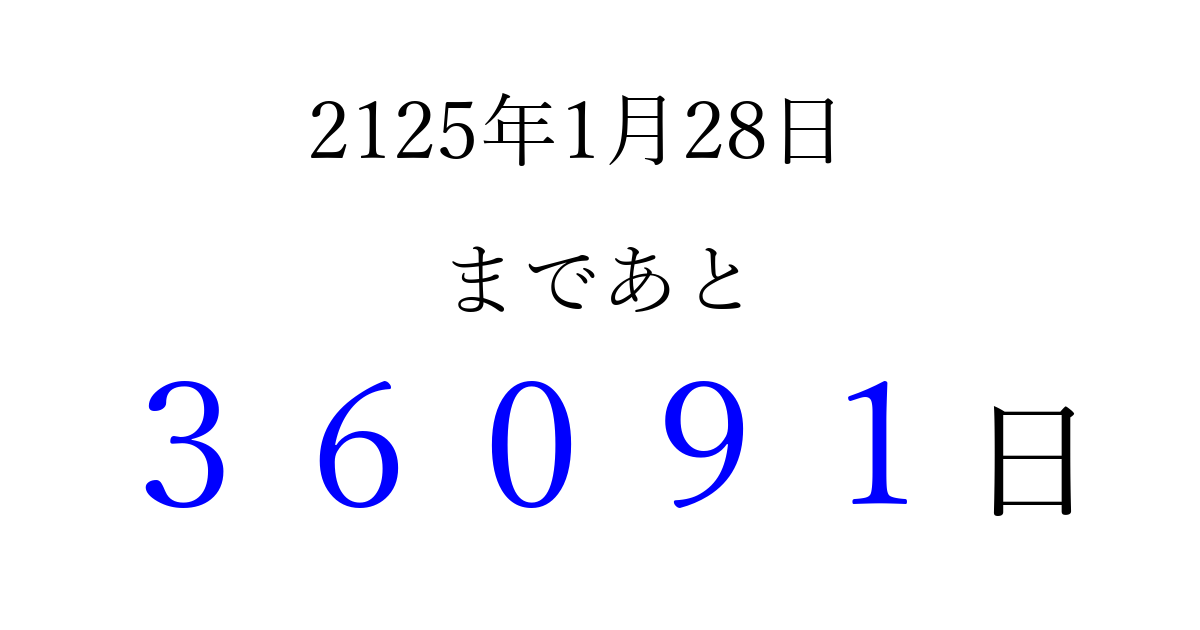 2125年1月28日(日)まで あと 99999 日です 追加すると、トップページからすぐ選べるようになります ※2026/04/06現在の結果です。 最新の状態に更新する ↓シェアして、タイムライン上にカウントダウンを表示しよう!↓ 📤 この結果を共有する Tweet シェア Threads Bluesky 別の日付でカウントダウン 2125年1月のカレンダー このページをブックマークに追加すると、いつでもカウントダウンを確認できます。 (PC: Ctrl+D / Mac: ⌘+D) hitome-notes.comでは以下のページも運営しています。 指定日と期間から日付を計算 | ガチャ確率計算・シミュレーション | プライバシー・ポリシー 運営者:Avocado