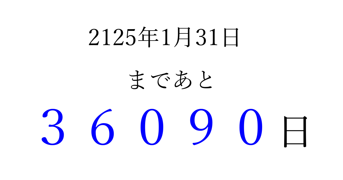 2125年1月31日(水)まで あと 99999 日です 追加すると、トップページからすぐ選べるようになります ※2026/04/10現在の結果です。 最新の状態に更新する ↓シェアして、タイムライン上にカウントダウンを表示しよう!↓ 📤 この結果を共有する Tweet シェア Threads Bluesky 別の日付でカウントダウン 2125年1月のカレンダー このページをブックマークに追加すると、いつでもカウントダウンを確認できます。 (PC: Ctrl+D / Mac: ⌘+D) hitome-notes.comでは以下のページも運営しています。 指定日と期間から日付を計算 | ガチャ確率計算・シミュレーション | プライバシー・ポリシー 運営者:Avocado