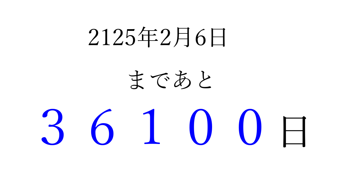 2125年2月6日(火)まで あと 99999 日です 追加すると、トップページからすぐ選べるようになります ※2026/04/06現在の結果です。 最新の状態に更新する ↓シェアして、タイムライン上にカウントダウンを表示しよう!↓ 📤 この結果を共有する Tweet シェア Threads Bluesky 別の日付でカウントダウン 2125年2月のカレンダー このページをブックマークに追加すると、いつでもカウントダウンを確認できます。 (PC: Ctrl+D / Mac: ⌘+D) hitome-notes.comでは以下のページも運営しています。 指定日と期間から日付を計算 | ガチャ確率計算・シミュレーション | プライバシー・ポリシー 運営者:Avocado