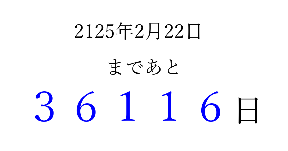 2125年2月22日(木)まで あと 99999 日です 追加すると、トップページからすぐ選べるようになります ※2026/04/06現在の結果です。 最新の状態に更新する ↓シェアして、タイムライン上にカウントダウンを表示しよう!↓ 📤 この結果を共有する Tweet シェア Threads Bluesky 別の日付でカウントダウン 2125年2月のカレンダー このページをブックマークに追加すると、いつでもカウントダウンを確認できます。 (PC: Ctrl+D / Mac: ⌘+D) hitome-notes.comでは以下のページも運営しています。 指定日と期間から日付を計算 | ガチャ確率計算・シミュレーション | プライバシー・ポリシー 運営者:Avocado