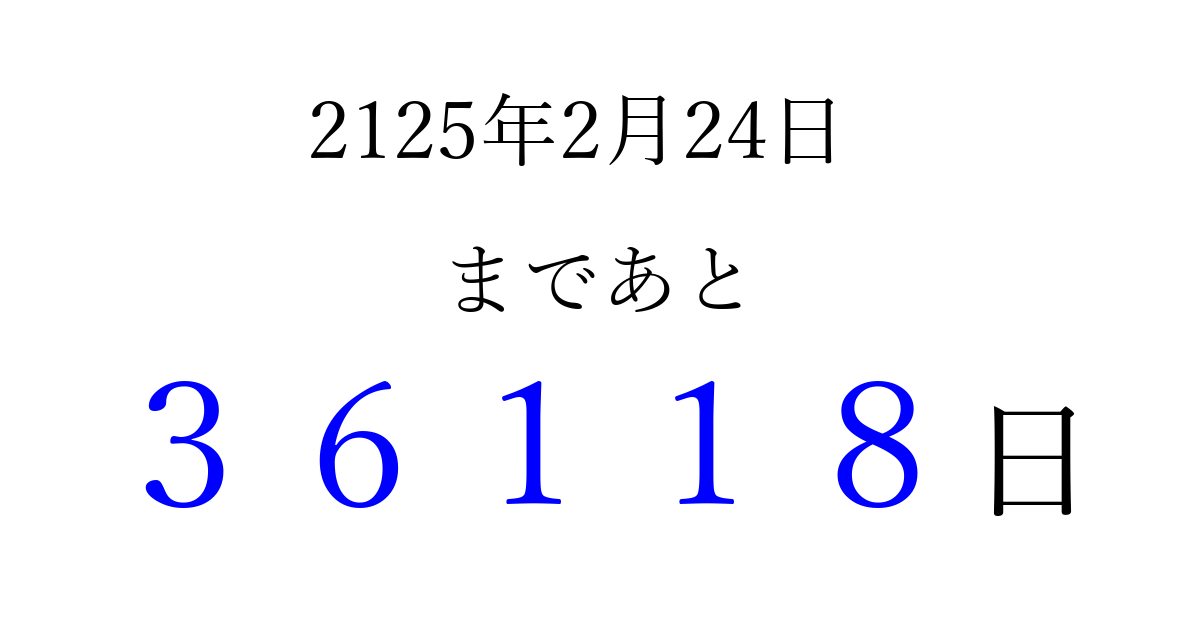 2125年2月24日(土)まで あと 99999 日です 追加すると、トップページからすぐ選べるようになります ※2026/04/06現在の結果です。 最新の状態に更新する ↓シェアして、タイムライン上にカウントダウンを表示しよう!↓ 📤 この結果を共有する Tweet シェア Threads Bluesky 別の日付でカウントダウン 2125年2月のカレンダー このページをブックマークに追加すると、いつでもカウントダウンを確認できます。 (PC: Ctrl+D / Mac: ⌘+D) hitome-notes.comでは以下のページも運営しています。 指定日と期間から日付を計算 | ガチャ確率計算・シミュレーション | プライバシー・ポリシー 運営者:Avocado