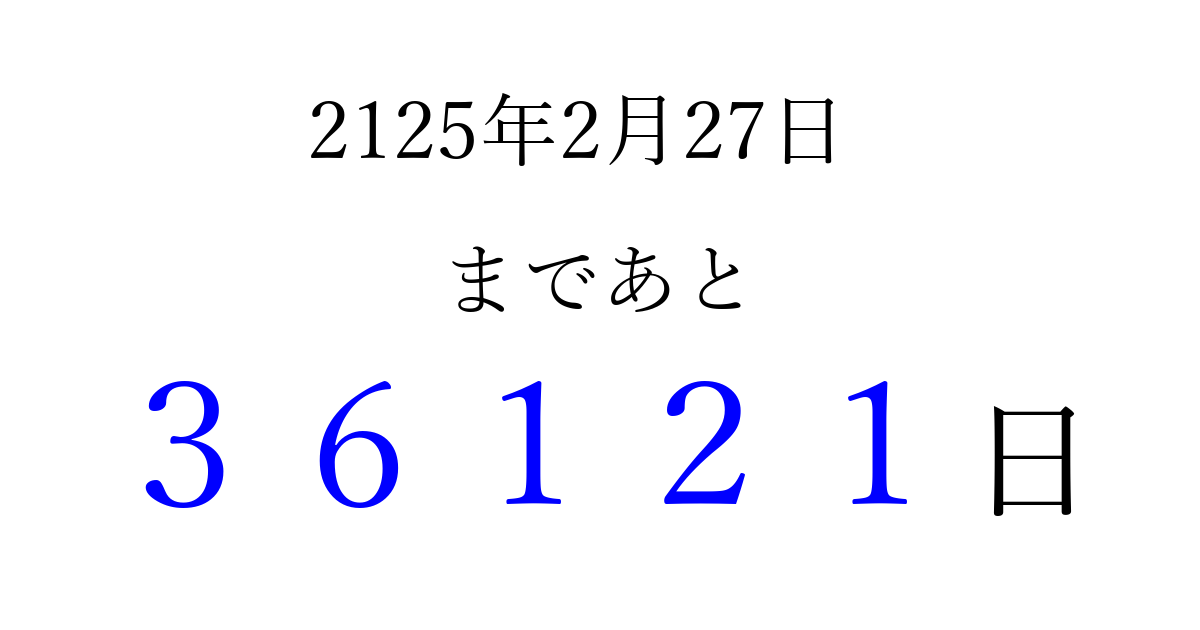 2125年2月27日(火)まで あと 99999 日です 追加すると、トップページからすぐ選べるようになります ※2026/04/06現在の結果です。 最新の状態に更新する ↓シェアして、タイムライン上にカウントダウンを表示しよう!↓ 📤 この結果を共有する Tweet シェア Threads Bluesky 別の日付でカウントダウン 2125年2月のカレンダー このページをブックマークに追加すると、いつでもカウントダウンを確認できます。 (PC: Ctrl+D / Mac: ⌘+D) hitome-notes.comでは以下のページも運営しています。 指定日と期間から日付を計算 | ガチャ確率計算・シミュレーション | プライバシー・ポリシー 運営者:Avocado