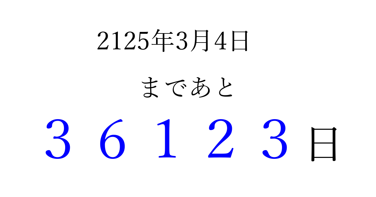 2125年3月4日(日)まで あと 99999 日です 追加すると、トップページからすぐ選べるようになります ※2026/04/09現在の結果です。 最新の状態に更新する ↓シェアして、タイムライン上にカウントダウンを表示しよう!↓ 📤 この結果を共有する Tweet シェア Threads Bluesky 別の日付でカウントダウン 2125年3月のカレンダー このページをブックマークに追加すると、いつでもカウントダウンを確認できます。 (PC: Ctrl+D / Mac: ⌘+D) hitome-notes.comでは以下のページも運営しています。 指定日と期間から日付を計算 | ガチャ確率計算・シミュレーション | プライバシー・ポリシー 運営者:Avocado
