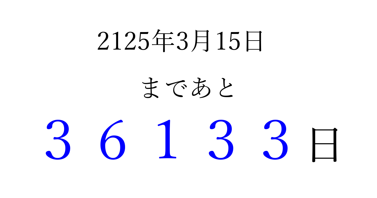 2125年3月15日(木)まで あと 99999 日です 追加すると、トップページからすぐ選べるようになります ※2026/04/10現在の結果です。 最新の状態に更新する ↓シェアして、タイムライン上にカウントダウンを表示しよう!↓ 📤 この結果を共有する Tweet シェア Threads Bluesky 別の日付でカウントダウン 2125年3月のカレンダー このページをブックマークに追加すると、いつでもカウントダウンを確認できます。 (PC: Ctrl+D / Mac: ⌘+D) hitome-notes.comでは以下のページも運営しています。 指定日と期間から日付を計算 | ガチャ確率計算・シミュレーション | プライバシー・ポリシー 運営者:Avocado
