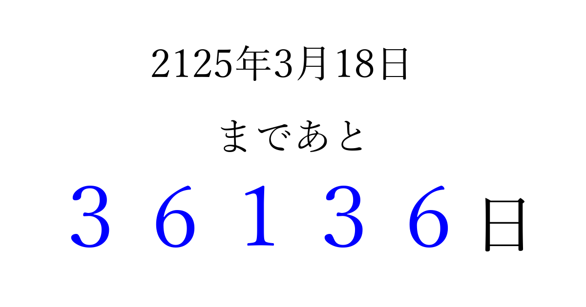 2125年3月18日(日)まで あと 99999 日です 追加すると、トップページからすぐ選べるようになります ※2026/04/10現在の結果です。 最新の状態に更新する ↓シェアして、タイムライン上にカウントダウンを表示しよう!↓ 📤 この結果を共有する Tweet シェア Threads Bluesky 別の日付でカウントダウン 2125年3月のカレンダー このページをブックマークに追加すると、いつでもカウントダウンを確認できます。 (PC: Ctrl+D / Mac: ⌘+D) hitome-notes.comでは以下のページも運営しています。 指定日と期間から日付を計算 | ガチャ確率計算・シミュレーション | プライバシー・ポリシー 運営者:Avocado