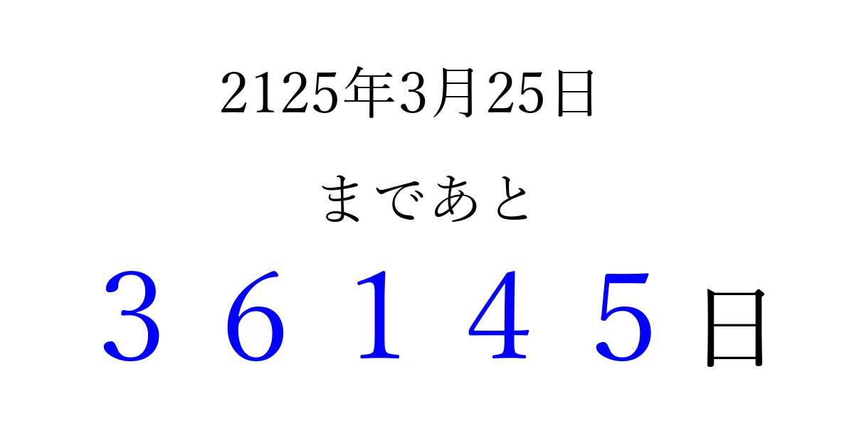 2125年3月25日(日)まで あと 99999 日です 追加すると、トップページからすぐ選べるようになります ※2026/04/08現在の結果です。 最新の状態に更新する ↓シェアして、タイムライン上にカウントダウンを表示しよう!↓ 📤 この結果を共有する Tweet シェア Threads Bluesky 別の日付でカウントダウン 2125年3月のカレンダー このページをブックマークに追加すると、いつでもカウントダウンを確認できます。 (PC: Ctrl+D / Mac: ⌘+D) hitome-notes.comでは以下のページも運営しています。 指定日と期間から日付を計算 | ガチャ確率計算・シミュレーション | プライバシー・ポリシー 運営者:Avocado