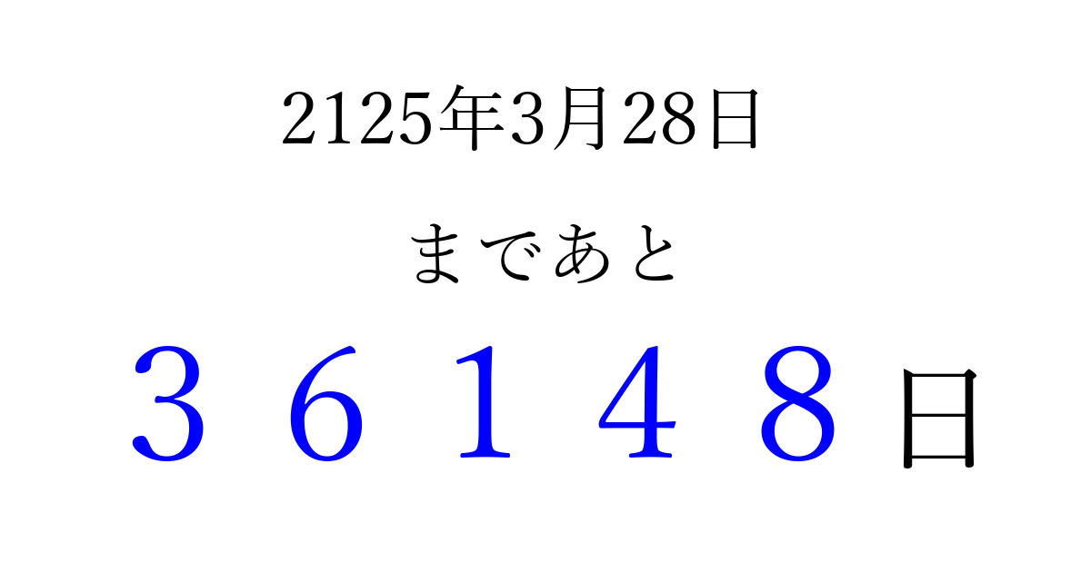 2125年3月28日(水)まで あと 99999 日です 追加すると、トップページからすぐ選べるようになります ※2026/04/08現在の結果です。 最新の状態に更新する ↓シェアして、タイムライン上にカウントダウンを表示しよう!↓ 📤 この結果を共有する Tweet シェア Threads Bluesky 別の日付でカウントダウン 2125年3月のカレンダー このページをブックマークに追加すると、いつでもカウントダウンを確認できます。 (PC: Ctrl+D / Mac: ⌘+D) hitome-notes.comでは以下のページも運営しています。 指定日と期間から日付を計算 | ガチャ確率計算・シミュレーション | プライバシー・ポリシー 運営者:Avocado