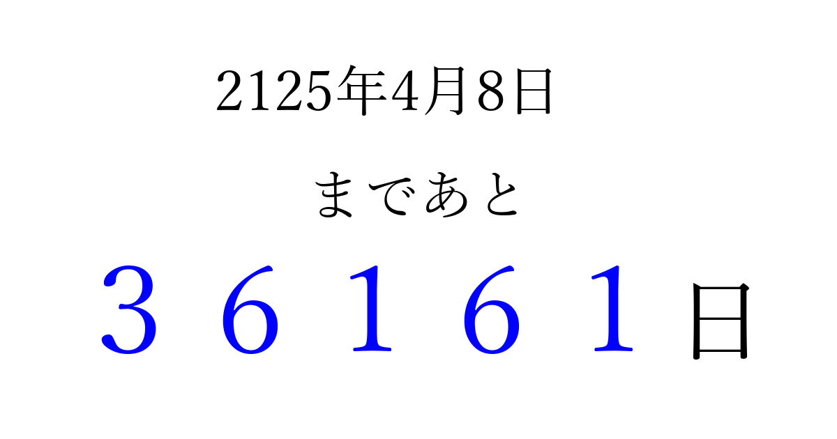 2125年4月8日(日)まで あと 99999 日です 追加すると、トップページからすぐ選べるようになります ※2026/04/06現在の結果です。 最新の状態に更新する ↓シェアして、タイムライン上にカウントダウンを表示しよう!↓ 📤 この結果を共有する Tweet シェア Threads Bluesky 別の日付でカウントダウン 2125年4月のカレンダー このページをブックマークに追加すると、いつでもカウントダウンを確認できます。 (PC: Ctrl+D / Mac: ⌘+D) hitome-notes.comでは以下のページも運営しています。 指定日と期間から日付を計算 | ガチャ確率計算・シミュレーション | プライバシー・ポリシー 運営者:Avocado