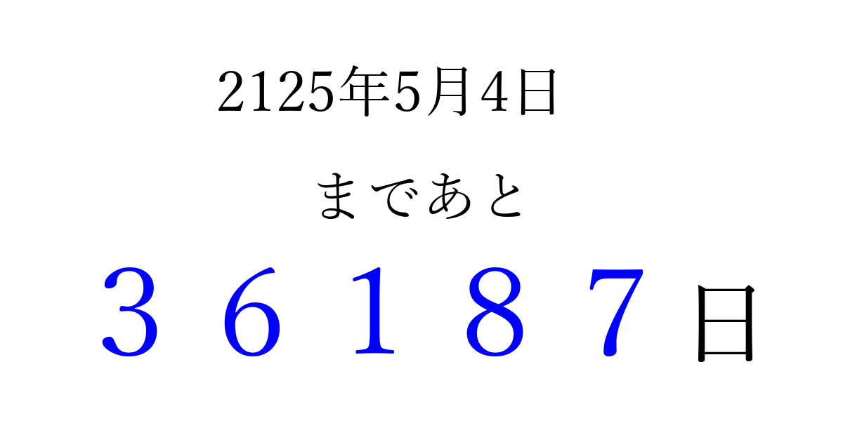 2125年5月4日(金)まで あと 99999 日です 追加すると、トップページからすぐ選べるようになります ※2026/04/06現在の結果です。 最新の状態に更新する ↓シェアして、タイムライン上にカウントダウンを表示しよう!↓ 📤 この結果を共有する Tweet シェア Threads Bluesky 別の日付でカウントダウン 2125年5月のカレンダー このページをブックマークに追加すると、いつでもカウントダウンを確認できます。 (PC: Ctrl+D / Mac: ⌘+D) hitome-notes.comでは以下のページも運営しています。 指定日と期間から日付を計算 | ガチャ確率計算・シミュレーション | プライバシー・ポリシー 運営者:Avocado