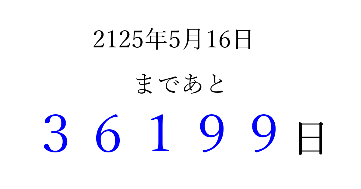 2125年5月16日(水)まで あと 99999 日です 追加すると、トップページからすぐ選べるようになります ※2026/04/06現在の結果です。 最新の状態に更新する ↓シェアして、タイムライン上にカウントダウンを表示しよう!↓ 📤 この結果を共有する Tweet シェア Threads Bluesky 別の日付でカウントダウン 2125年5月のカレンダー このページをブックマークに追加すると、いつでもカウントダウンを確認できます。 (PC: Ctrl+D / Mac: ⌘+D) hitome-notes.comでは以下のページも運営しています。 指定日と期間から日付を計算 | ガチャ確率計算・シミュレーション | プライバシー・ポリシー 運営者:Avocado
