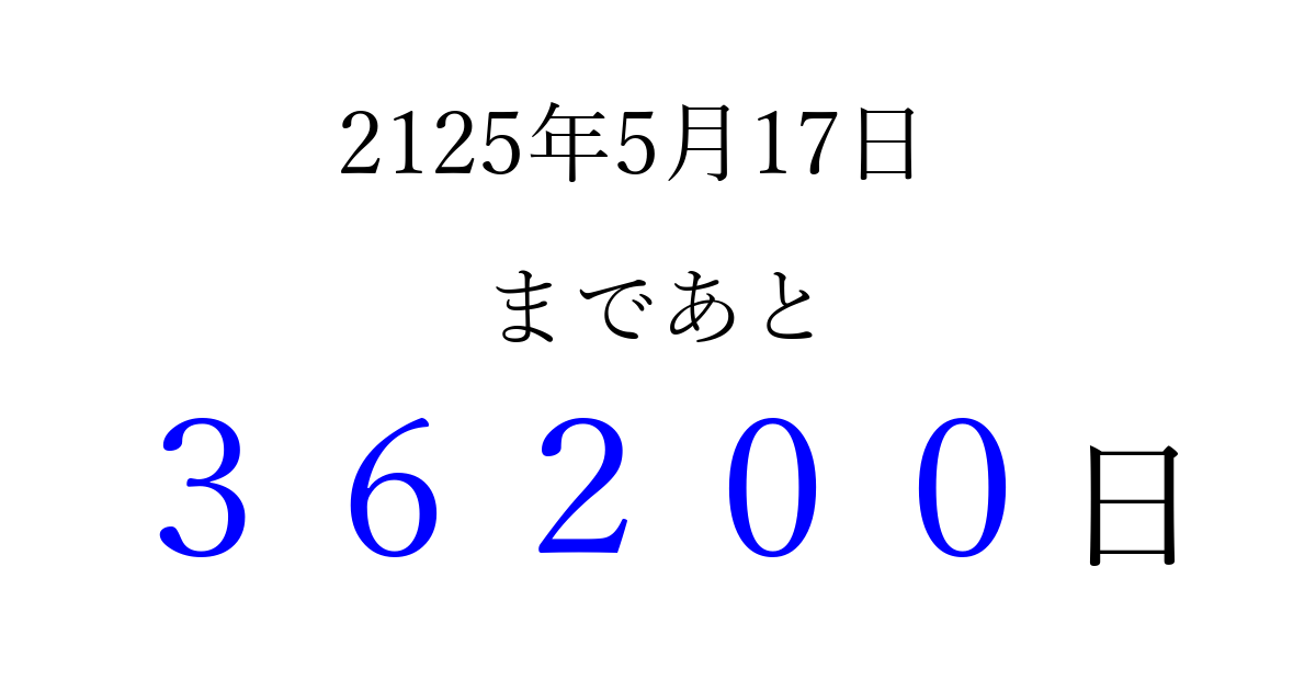 2125年5月17日(木)まで あと 99999 日です 追加すると、トップページからすぐ選べるようになります ※2026/04/06現在の結果です。 最新の状態に更新する ↓シェアして、タイムライン上にカウントダウンを表示しよう!↓ 📤 この結果を共有する Tweet シェア Threads Bluesky 別の日付でカウントダウン 2125年5月のカレンダー このページをブックマークに追加すると、いつでもカウントダウンを確認できます。 (PC: Ctrl+D / Mac: ⌘+D) hitome-notes.comでは以下のページも運営しています。 指定日と期間から日付を計算 | ガチャ確率計算・シミュレーション | プライバシー・ポリシー 運営者:Avocado
