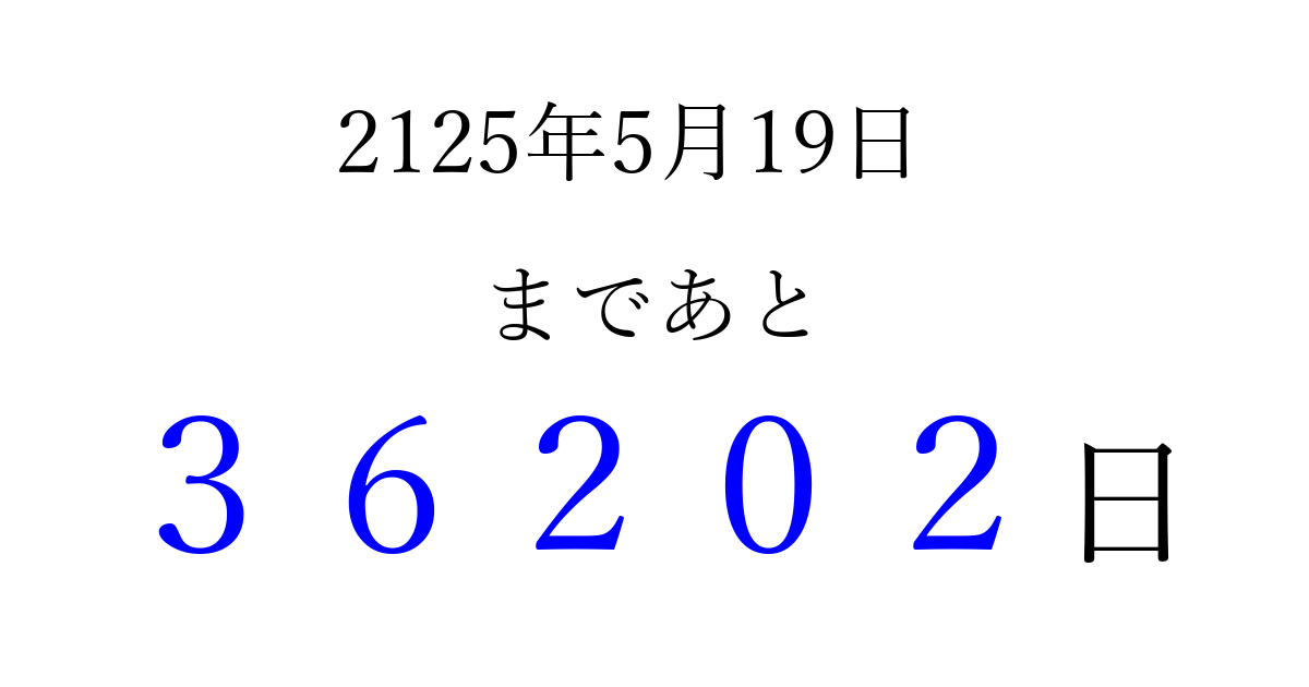 2125年5月19日(土)まで あと 99999 日です 追加すると、トップページからすぐ選べるようになります ※2026/04/06現在の結果です。 最新の状態に更新する ↓シェアして、タイムライン上にカウントダウンを表示しよう!↓ 📤 この結果を共有する Tweet シェア Threads Bluesky 別の日付でカウントダウン 2125年5月のカレンダー このページをブックマークに追加すると、いつでもカウントダウンを確認できます。 (PC: Ctrl+D / Mac: ⌘+D) hitome-notes.comでは以下のページも運営しています。 指定日と期間から日付を計算 | ガチャ確率計算・シミュレーション | プライバシー・ポリシー 運営者:Avocado
