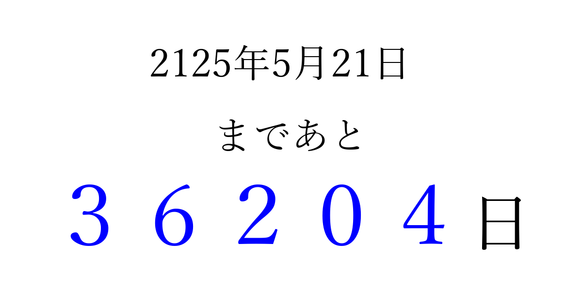 2125年5月21日(月)まで あと 99999 日です 追加すると、トップページからすぐ選べるようになります ※2026/04/06現在の結果です。 最新の状態に更新する ↓シェアして、タイムライン上にカウントダウンを表示しよう!↓ 📤 この結果を共有する Tweet シェア Threads Bluesky 別の日付でカウントダウン 2125年5月のカレンダー このページをブックマークに追加すると、いつでもカウントダウンを確認できます。 (PC: Ctrl+D / Mac: ⌘+D) hitome-notes.comでは以下のページも運営しています。 指定日と期間から日付を計算 | ガチャ確率計算・シミュレーション | プライバシー・ポリシー 運営者:Avocado