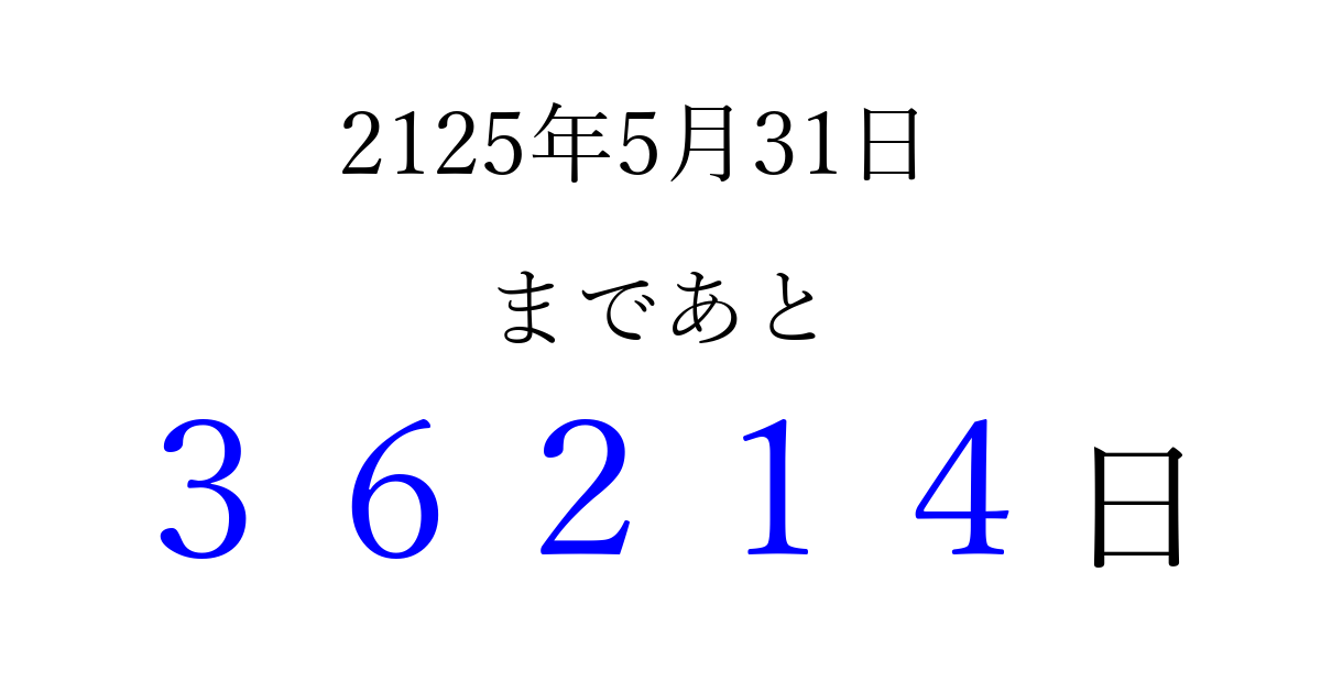 2125年5月31日(木)まで あと 99999 日です 追加すると、トップページからすぐ選べるようになります ※2026/04/06現在の結果です。 最新の状態に更新する ↓シェアして、タイムライン上にカウントダウンを表示しよう!↓ 📤 この結果を共有する Tweet シェア Threads Bluesky 別の日付でカウントダウン 2125年5月のカレンダー このページをブックマークに追加すると、いつでもカウントダウンを確認できます。 (PC: Ctrl+D / Mac: ⌘+D) hitome-notes.comでは以下のページも運営しています。 指定日と期間から日付を計算 | ガチャ確率計算・シミュレーション | プライバシー・ポリシー 運営者:Avocado