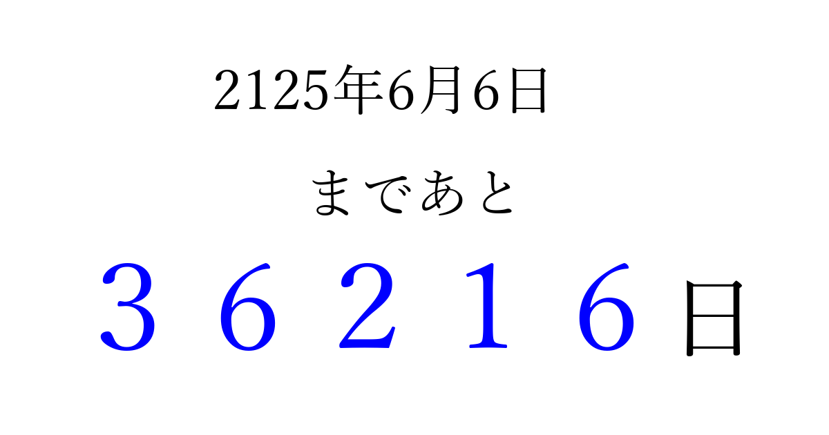 2125年6月6日(水)まで あと 99999 日です 追加すると、トップページからすぐ選べるようになります ※2026/04/10現在の結果です。 最新の状態に更新する ↓シェアして、タイムライン上にカウントダウンを表示しよう!↓ 📤 この結果を共有する Tweet シェア Threads Bluesky 別の日付でカウントダウン 2125年6月のカレンダー このページをブックマークに追加すると、いつでもカウントダウンを確認できます。 (PC: Ctrl+D / Mac: ⌘+D) hitome-notes.comでは以下のページも運営しています。 指定日と期間から日付を計算 | ガチャ確率計算・シミュレーション | プライバシー・ポリシー 運営者:Avocado