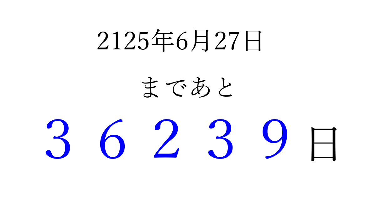 2125年6月27日(水)まで あと 99999 日です 追加すると、トップページからすぐ選べるようになります ※2026/04/08現在の結果です。 最新の状態に更新する ↓シェアして、タイムライン上にカウントダウンを表示しよう!↓ 📤 この結果を共有する Tweet シェア Threads Bluesky 別の日付でカウントダウン 2125年6月のカレンダー このページをブックマークに追加すると、いつでもカウントダウンを確認できます。 (PC: Ctrl+D / Mac: ⌘+D) hitome-notes.comでは以下のページも運営しています。 指定日と期間から日付を計算 | ガチャ確率計算・シミュレーション | プライバシー・ポリシー 運営者:Avocado
