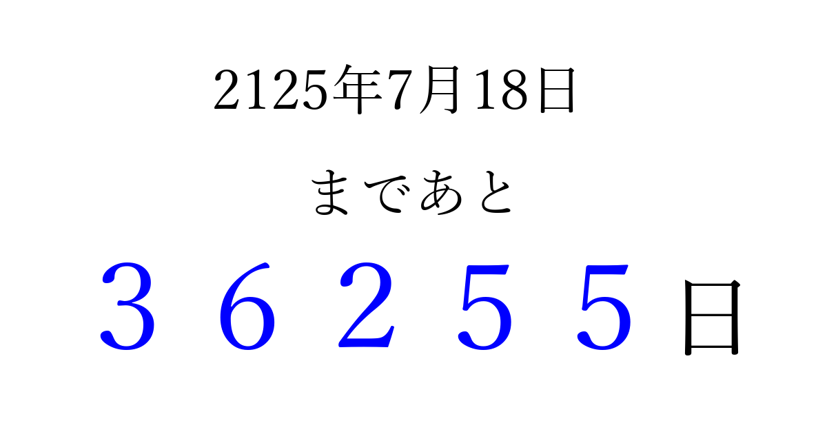 2125年7月18日(水)まで あと 99999 日です 追加すると、トップページからすぐ選べるようになります ※2026/04/13現在の結果です。 最新の状態に更新する ↓シェアして、タイムライン上にカウントダウンを表示しよう!↓ 📤 この結果を共有する Tweet シェア Threads Bluesky 別の日付でカウントダウン 2125年7月のカレンダー このページをブックマークに追加すると、いつでもカウントダウンを確認できます。 (PC: Ctrl+D / Mac: ⌘+D) hitome-notes.comでは以下のページも運営しています。 指定日と期間から日付を計算 | ガチャ確率計算・シミュレーション | プライバシー・ポリシー 運営者:Avocado